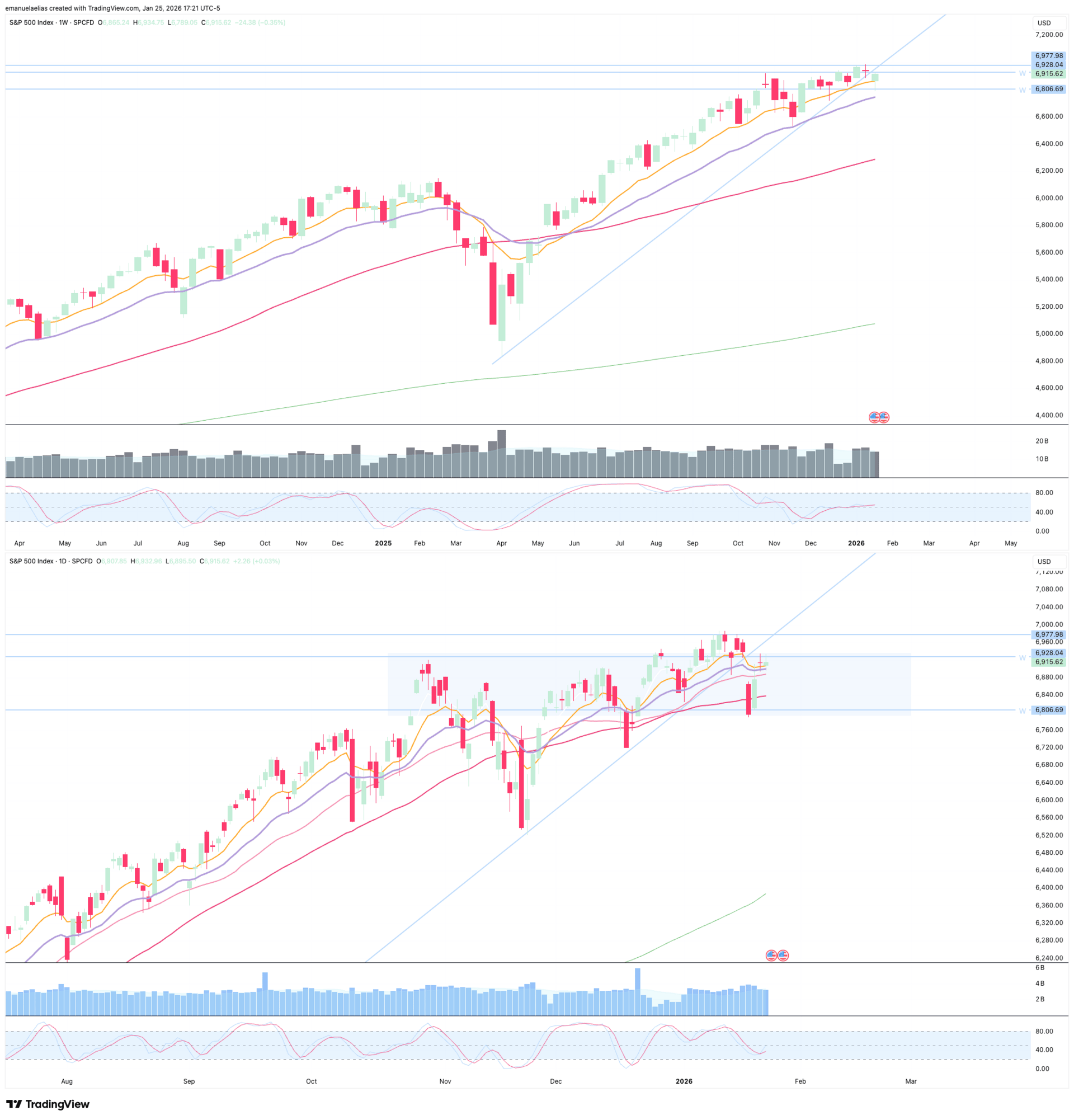 I’ve marked two key levels on the weekly chart, both have multiple touch points, but more importantly, these are the edges of the range we’ve been trading inside since October 2025, ~6928 on the upside and ~6806 on the downside. So even though SPX has continued to drift higher over time with higher lows and higher highs since the November dip, price has not broken out of this range in a decisive way. Structurally, this is still range-bound, and my bias is still neutral.