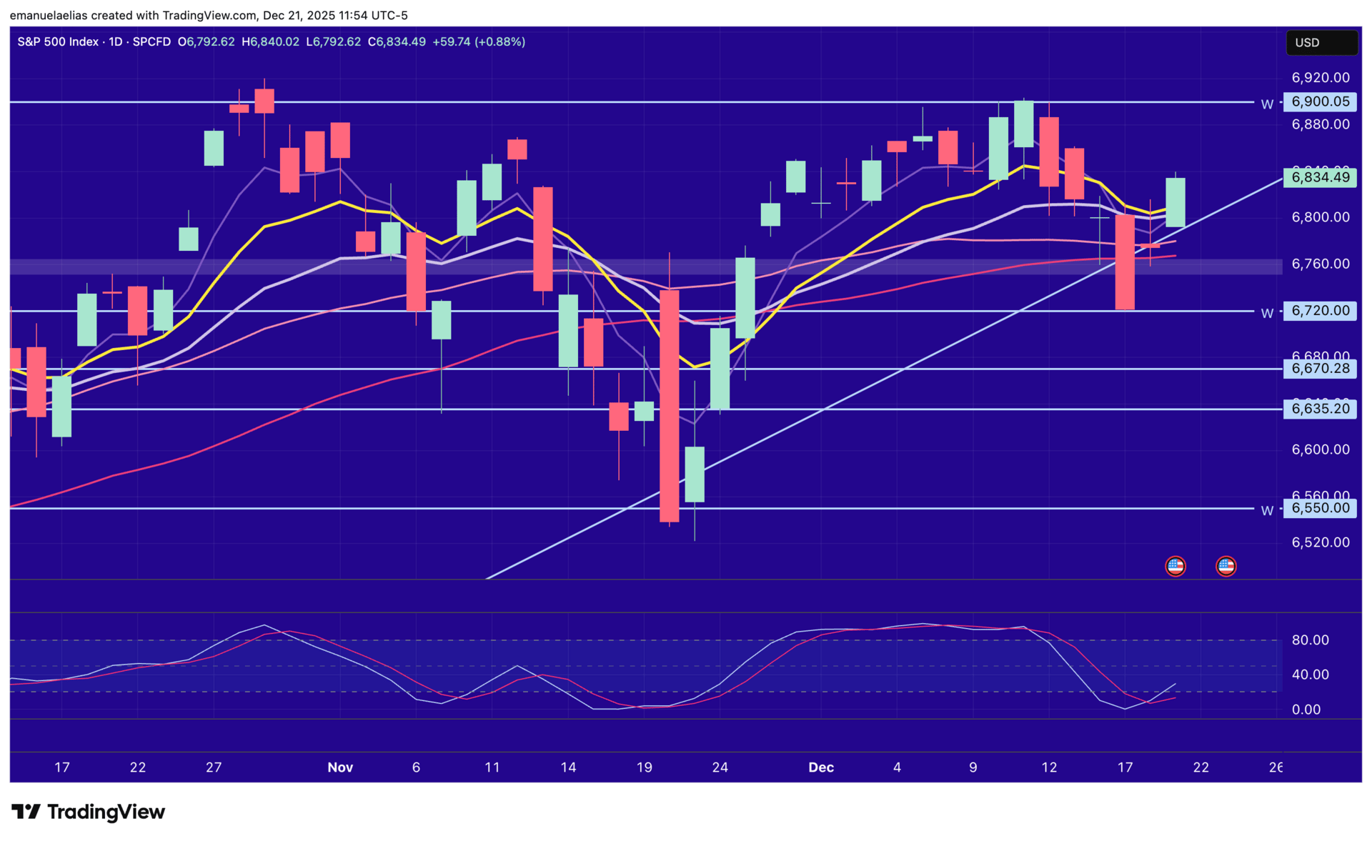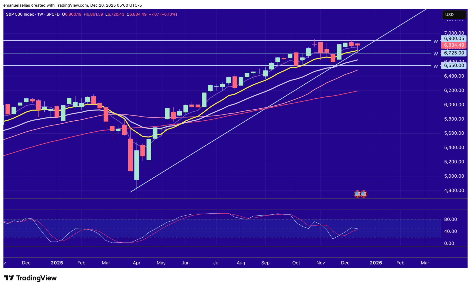 Going into next week, if I had to pick a direction off the weekly alone, I’m leaning bullish, mostly because buyers defended that 6,725 area and stepped in off the 10 EMA and uptrend line. But I’ll lay out both sides, and keep in mind we could remain range bound.