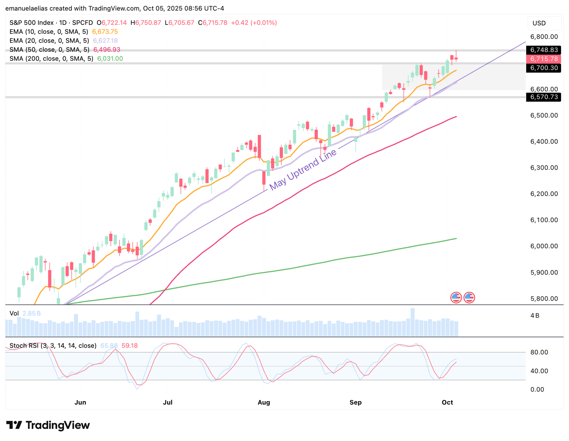 The shaded area between roughly 6,600 and 6,700 is where the index consolidated through mid to late September before breaking out on October 1. If we do slow down, that zone could easily act as a digestion range before another leg higher.