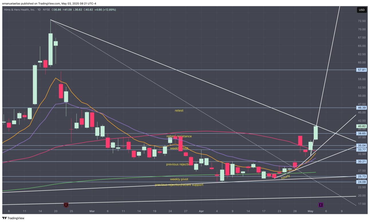 HIMS had a sharp move off its recent base, breaking out of a multi-week range between 24 and 30. It cleared several resistance levels and is now trading above all major moving averages on both the daily and weekly charts (a strong technical signal).