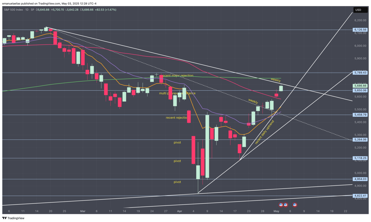 The S&P popped through last week’s downtrend line, back above its 10 and 20 EMAs, and closed strong on Friday near 5,686. On the weekly chart, we can see how it pulled back ever so slightly from its rising 50SMA (around 5,700). This is a key area that may act as resistance (or a place to retest if it rises above it) in the short term.